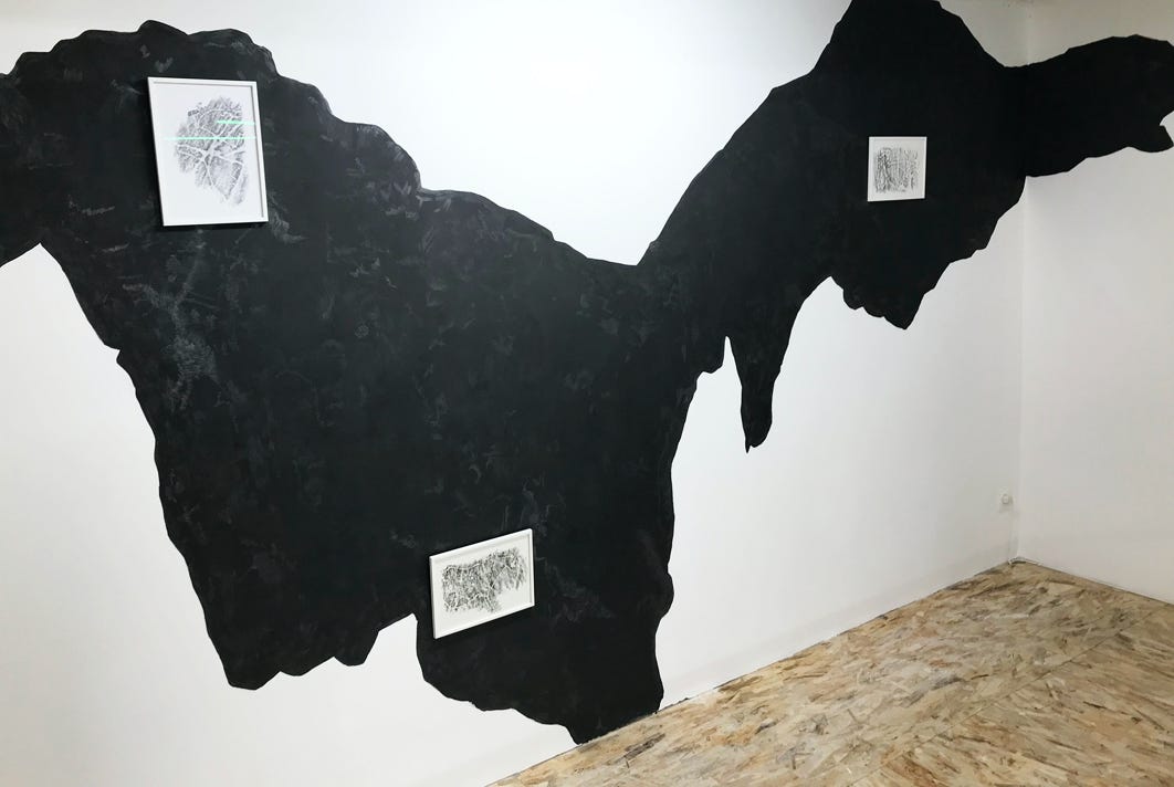 Ces gravures tracées intentionnellement se confondent avec les rayures naturelles de la roche, qui constituent alors un dessin périphérique au dessin intentionnel. Dans cette installation, le dessin périphérique autour des frottages de gravures rapportées devient un sujet à part entière se déployant d’une image à l’autre.