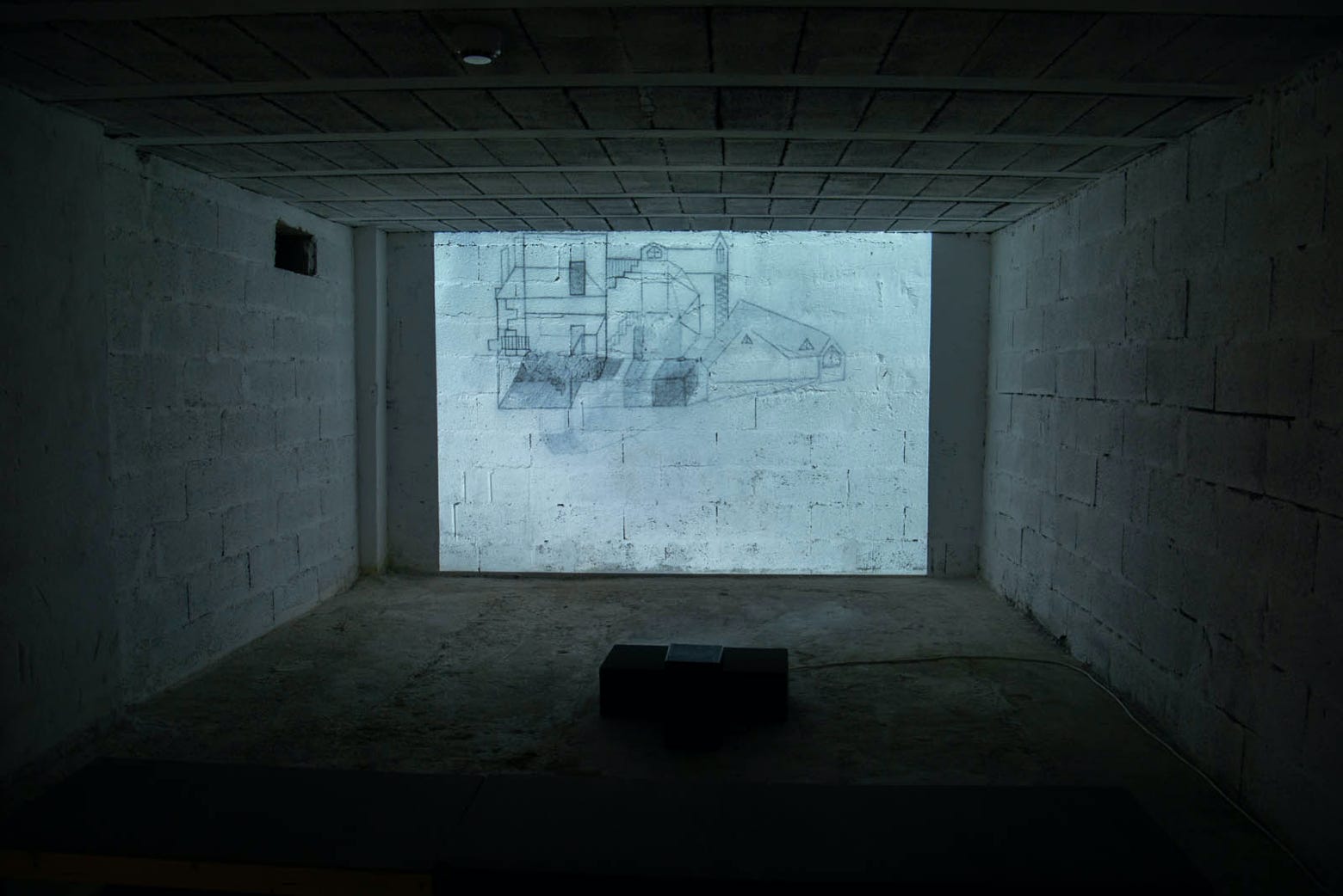 Ce processus a continué lors de la durée de l’exposition, et progressivement, le dessin a commencé à prendre directement en compte l’architecture du lieu d’exposition : les lignes du dessin ont commencé à suivre les lignes formées par les briques du mur sur lequel était projetée l’animation.